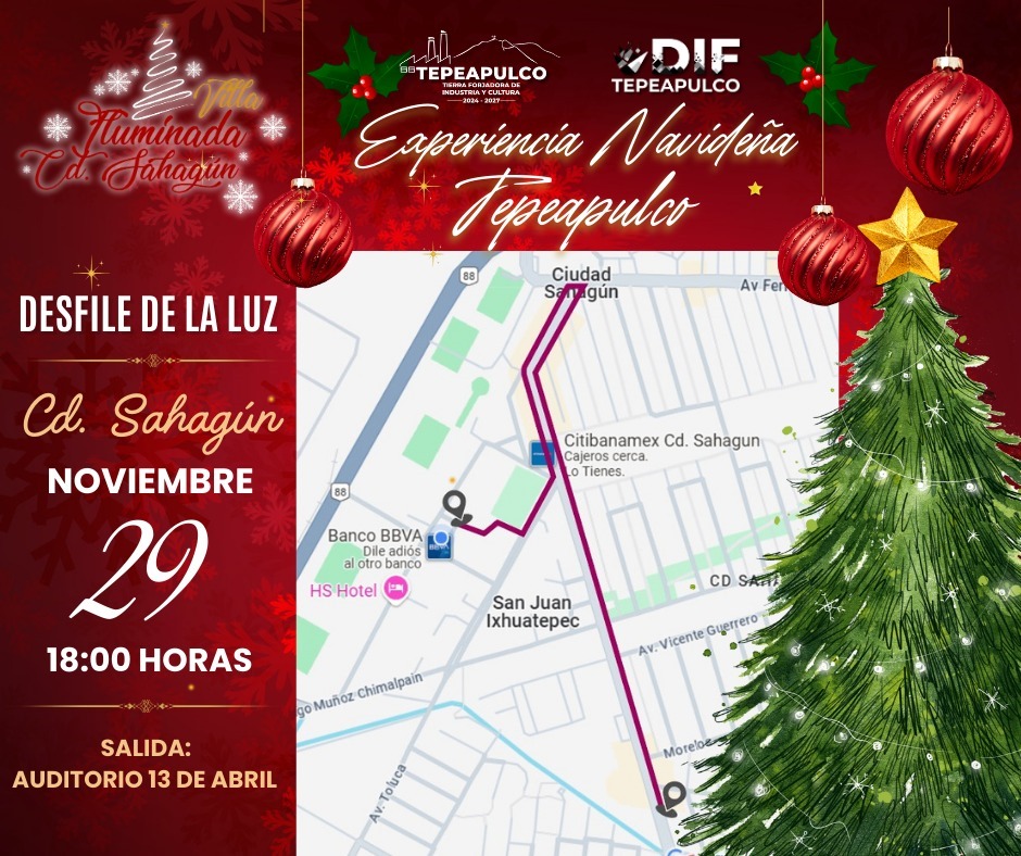 Este 28 de noviembre no te puedes perder el Desfile de la Luz Tepeapulco. 🌟 Una noche mágica llena de luces, música y una alegría desbordante que iluminará Tepeapulco. 🎆🎶